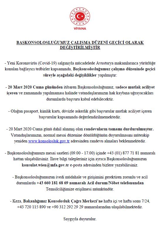 - Yeni Koronavirüs (Covid-19) salgınıyla mücadelede Avusturya makamlarınca yürürlüğe konulan bağlayıcı tedbirler kapsamında, Başkonsolosluğumuz çalışma düzeninde geçici süreyle aşağıdaki değişiklikler yapılmıştır: